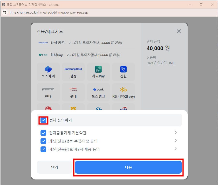 8. 결제창이 나오면 전체 동의하기 체트 후 다음 버튼을 누릅니다.
