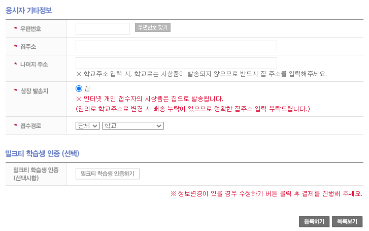 6. 이제 응시원서를 작성합니다. 응시자 기본정보와 응시자 수험정보, 응시자 기타 정보를 작성한 후 등록하기 버튼을 클릭합니다.