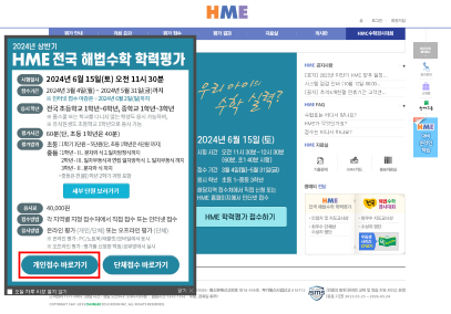 2. HME 사이트로 접속하시면 팝업창에 2024년 상반기 HME 전국 해법수학 학력평가 접수 바로가기 클릭합니다.