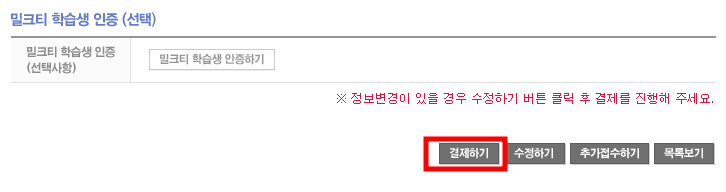 6. 응시료 결제 화면으로 넘어가면 등록하신 내용을 확인하신 후 수정할 내용이 있으시면 수정하기 버튼 수정할 내용이 없으시면 결제하기 버튼을 누릅니다.