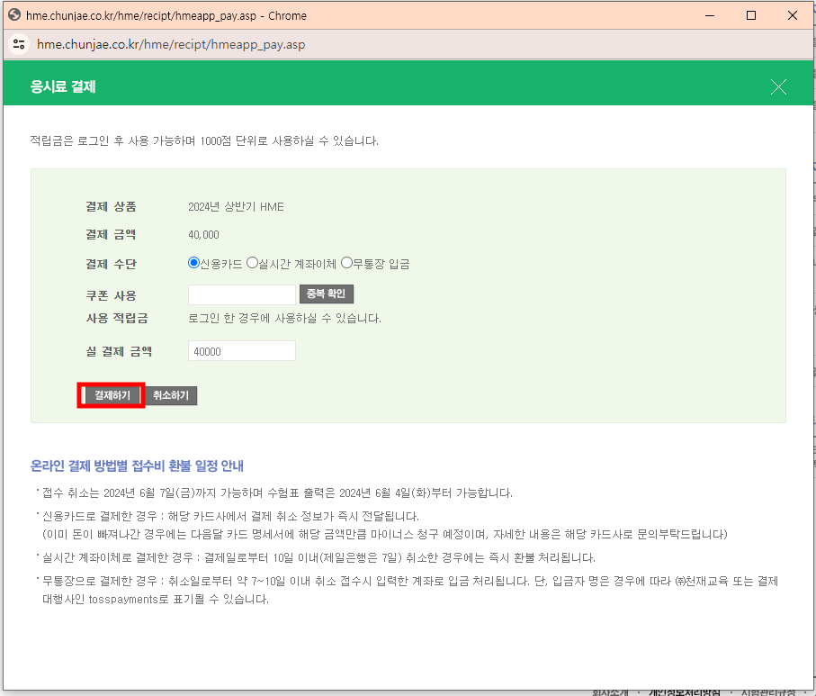 7. 응시수수료는 40,000원입니다. 결제하기 버튼 클릭합니다.